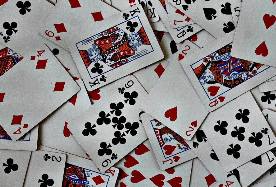 散落的撲克牌組合展示紅心、黑桃、方塊與梅花多種花色