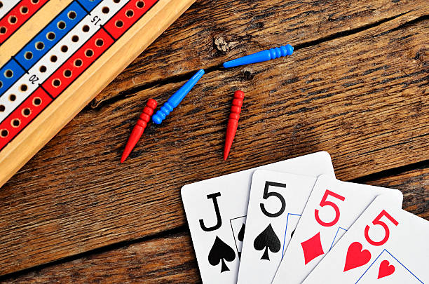 一副展示5點牌的撲克牌組合,背景是克里比奇(Cribbage)遊戲的計分板,帶有紅色和藍色的計分釘。